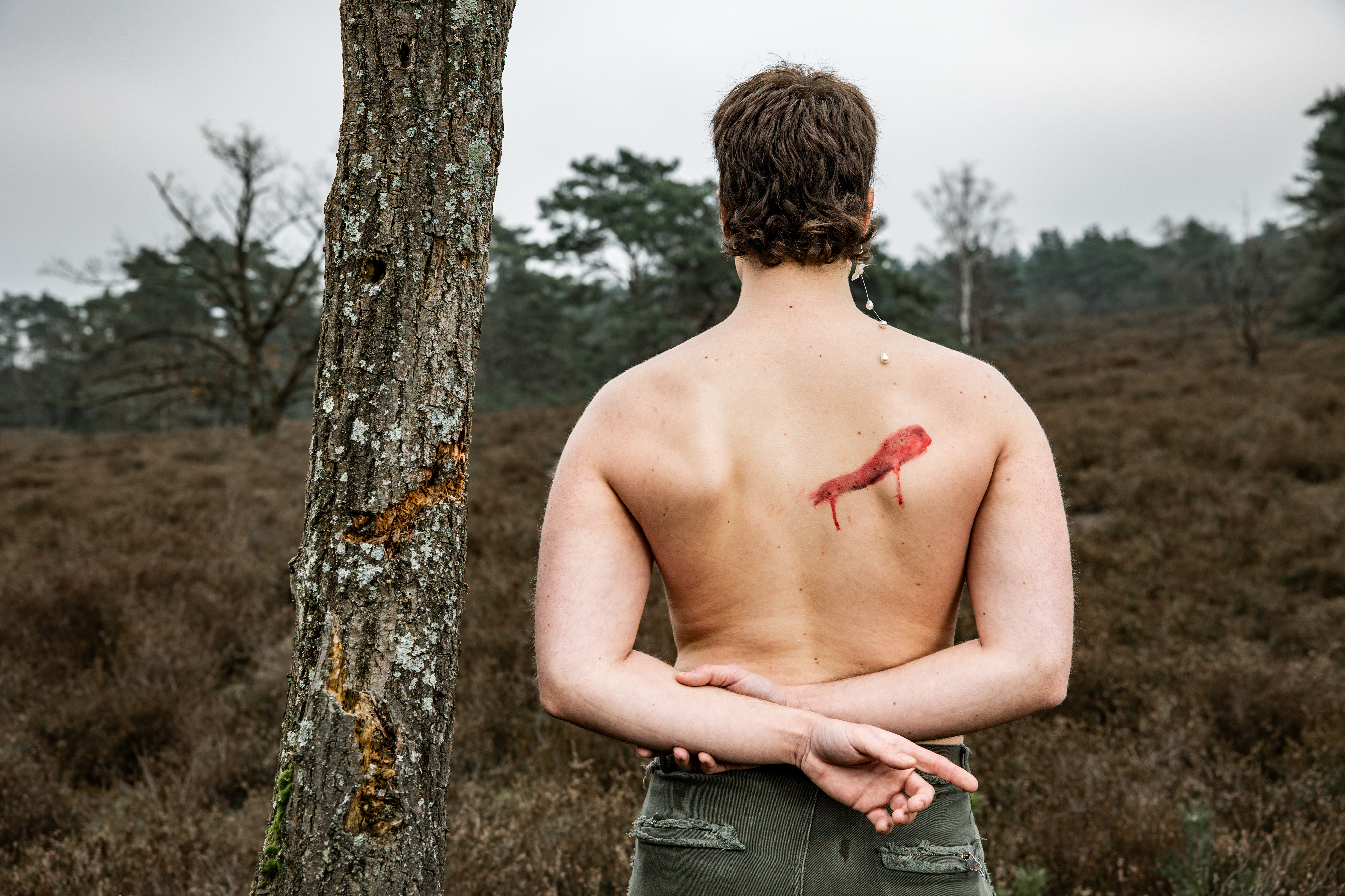 Drop-shaped earrings connotate sadness behind the scars of nature. How man continues to destroy nature for appearance’s sake. The boy is, as it were, a pillar of change.